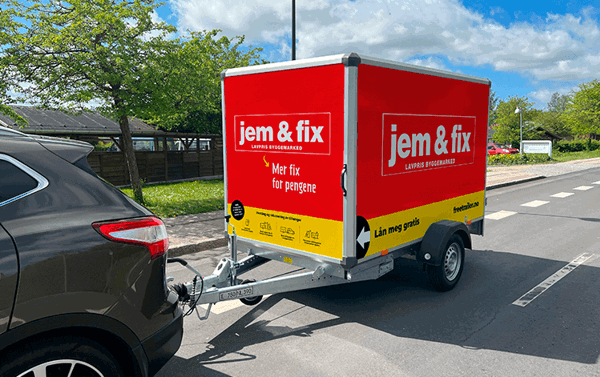 Du kan låne en tilhenger gratis for å frakte varene dine hjem, når du handler i jem & fix.