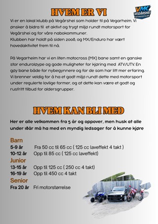 Vi driver en Motorsportklubb med hovedfokus på barn og ungdom, treningskvelder hver uke med MX/ENDURO og ATV . Glede og mestring i trygge omgivelser! https://www.facebook.com/vegarsheimotorsportklubb